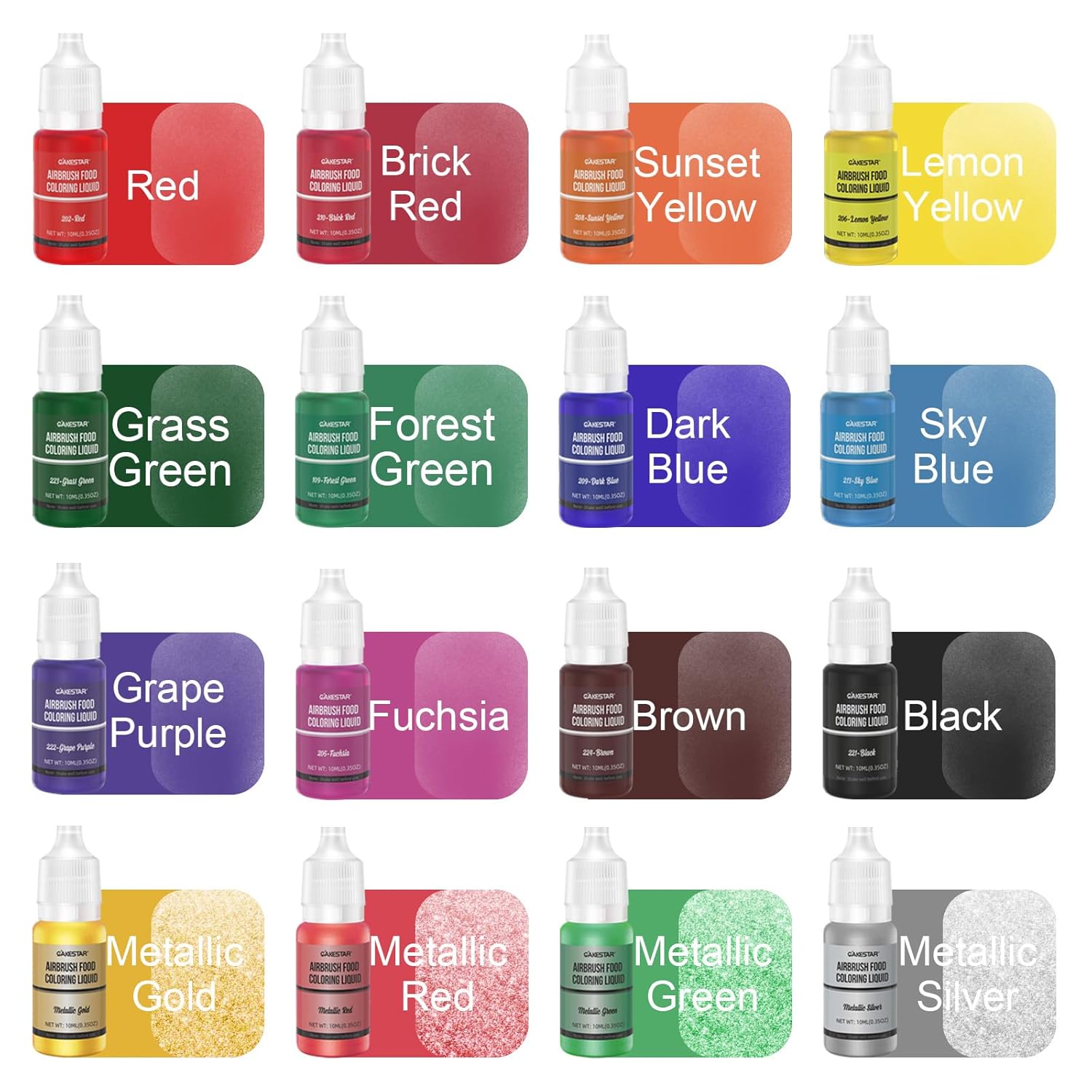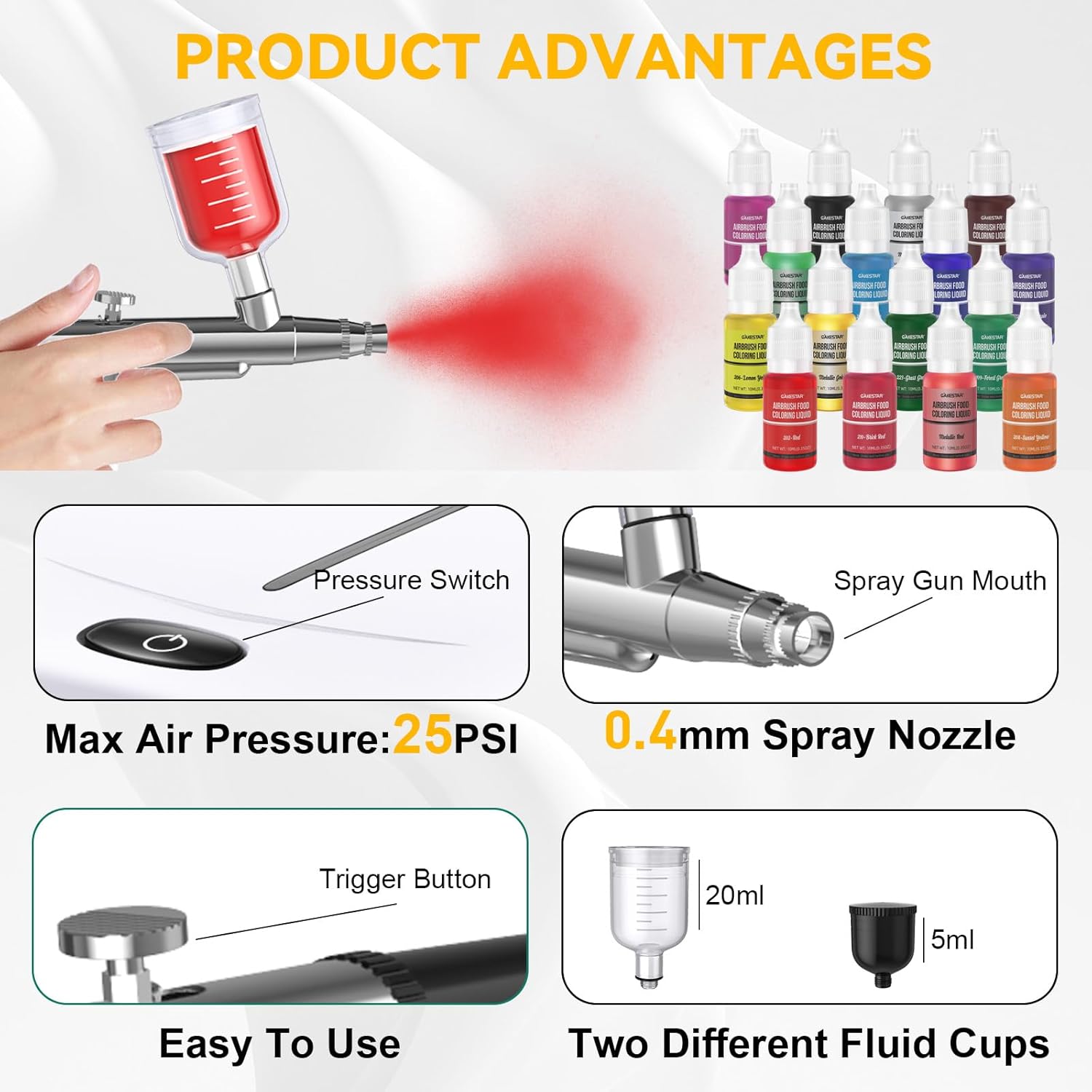π Includes 16 Vibrant Colors: Don't wait to start creating. This kit comes with a full palette of our specially formulated, clog-free airbrush colors. They are vibrant, food-safe, and ready to use.